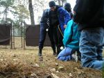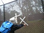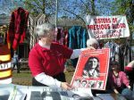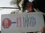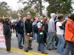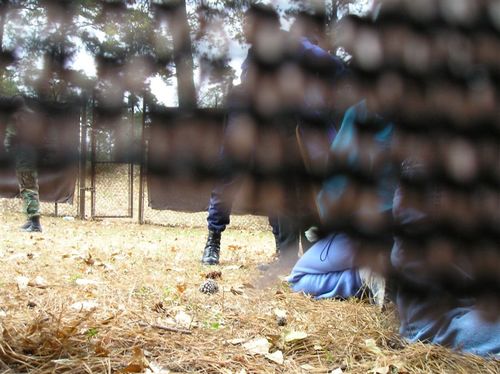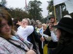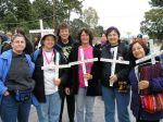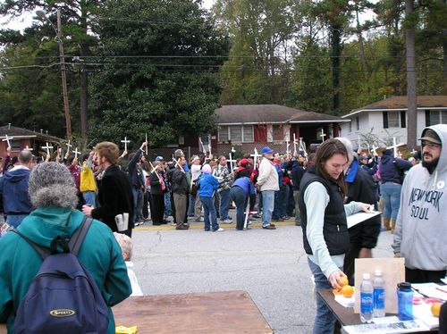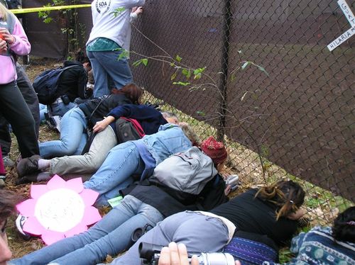 After the procession, some of us accompanied the people who had decided to “cross the line” in acts of civil disobedience up to the fence. Ā Two priests held up a section of the fence to Ft. Benning and the people crawled under to an area where soldiers were waiting to arrest them. Ā These brave people were willing to spend up to 6 months in jail for their convictions–I wish that I had that courage. Ā I saw one elderly woman carrying a white rose (as did many, if not all, of them), who was fighting back tears–she was determined, but must have been scared. Ā I saw another younger handicapped woman kiss her husband “Good-bye.”