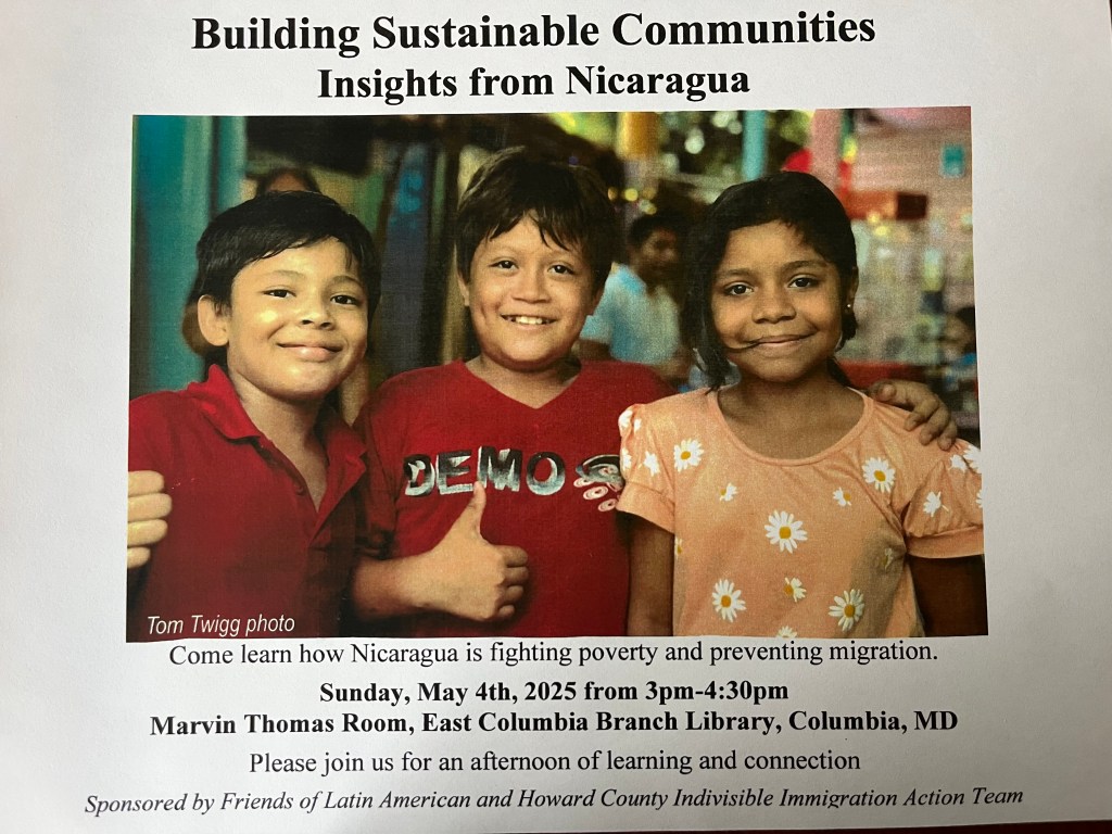 Come learn how Nicaragua is fighting poverty and preventing migration, with speaker Sarah Junkin Woodard from Jubilee House Community, a U.S. 501(c)(3) nonprofit she helped form in 1979. Sponsored by Friends of Latin America and Indivisible Howard County’s Immigration Action Team, the event will take place on Sunday, May 4th, 2025, 3pm-4:30pm, at the East Columbia Branch Library in Columbia, MD. The talk is part of Sarah’s Spring Talking Tour, started in February.